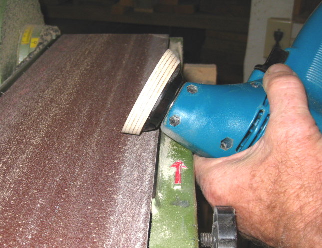Then I hold the spinning composition against a stationary belt sander and work it to about a 45 degree bevel. If all goes well it will run nice and true, but don't press too hard against the sander of the flex of the foam will lead to an oval disc. Here is a recently constructed sander with a plywood substrate being sanded even on the belt sander. Stop a few times and use scissors to cut off any leather that is running extra wide in places. This will help the sander cut it clean and true in the end.