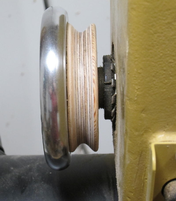 A piece of multi-veneer plywood is fitted to the handwheel and set-screwed firm.