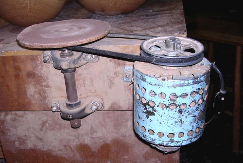 Commensurate with the hand-held sander is a braking system on the lathe. When I had a variable speed DC motor I found it acted as a brake in the opposite direction it was set to run. This helped hold the bowl in place as I was sanding. When I switched to variable speed AC motor I lost this feature. But then I passed a length of 3/8" O.D. rubber gas line from the auto parts store around the 4" drive pulley, and voila, a slip brake in both directions, easy to nudge forward with a hand but firm enough to resist the torque of sanding. I upgraded to a triple drive pulley so a groove is always available to drop the rubber over for sanding. A real advantage to this system is it frees up both hands to hold the sander. This greatly reduces the stress on the forearm that I found left me aching after a period of one-armed sanding. Plus, using two hands you are able to "float" the sander in your hands as you arc back and forth over the complex curves of a bowl, as well as gently sand around the top or the bowl to ease the sharp edges.