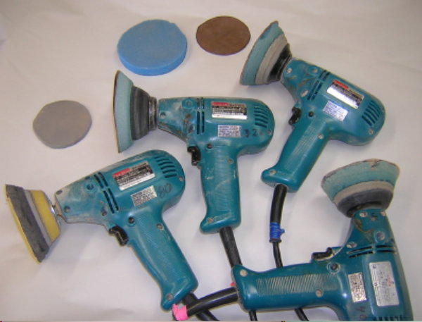 The backbone of my sanding is the Makita GV5000 sander/polisher. It is light and compact, allowing me to hold it close to the head, reducing arm fatigue. You can lock it on so you don't have to keep holding the trigger. It runs at 4000 rpm, way too fast for the foam or sandpaper, so I rigged up a standard household dimmer switch ganged to a duplex outlet and am able to dial in the preferred speed at will: faster with coarser grits, slower for the fine. No more wearing out the switch triggering it on and off to slow the sander down. The dimmer does not seem to harm the sander at all, witness I am still using the old 1984 one daily. I added a second duplex outlet to my dimmer switch, and now can switch back and forth between grits quickly as I work my way through sanding a piece. I believe my general speed is around 2,500 rpm. Some years back I got worried Makita might discontinue the model, and as I had not found anything comparable, I bought a second, a third, and now I have one for each grit. It speeds things up.